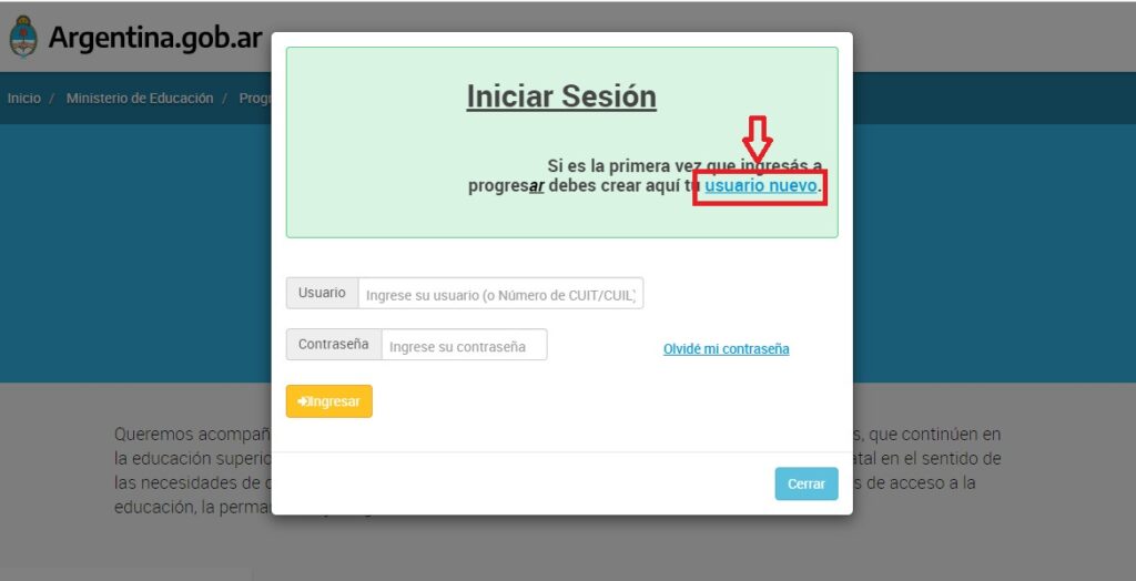- Ingresa al sitio web oficial de Progresar: https://www.argentina.gob.ar/educacion/progresar